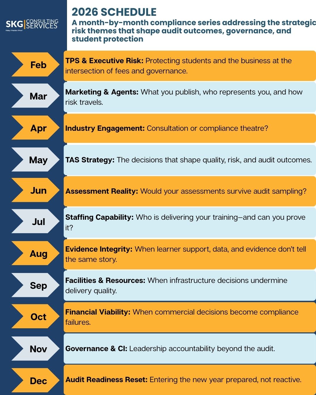 This page allows you to register your interest in the SKG Industry Capability Podcast & Webinar Series — a structured monthly program designed to support RTO owners, CEOs, compliance managers, and operational leaders across the VET sector. Each month focuses on a strategic compliance risk theme that influences audit outcomes, governance decisions, and student protection. Sessions are delivered through an industry conversation (podcast or webinar) and supported by a registrant-only insights brief that summarises key takeaways, common risk areas, and practical actions. A limited number of independent topic-aligned reviews may also be offered each month to selected RTOs from those who register. By registering your interest, you will receive updates on upcoming episode releases, webinar schedules, and registration links as the series progresses throughout the year.